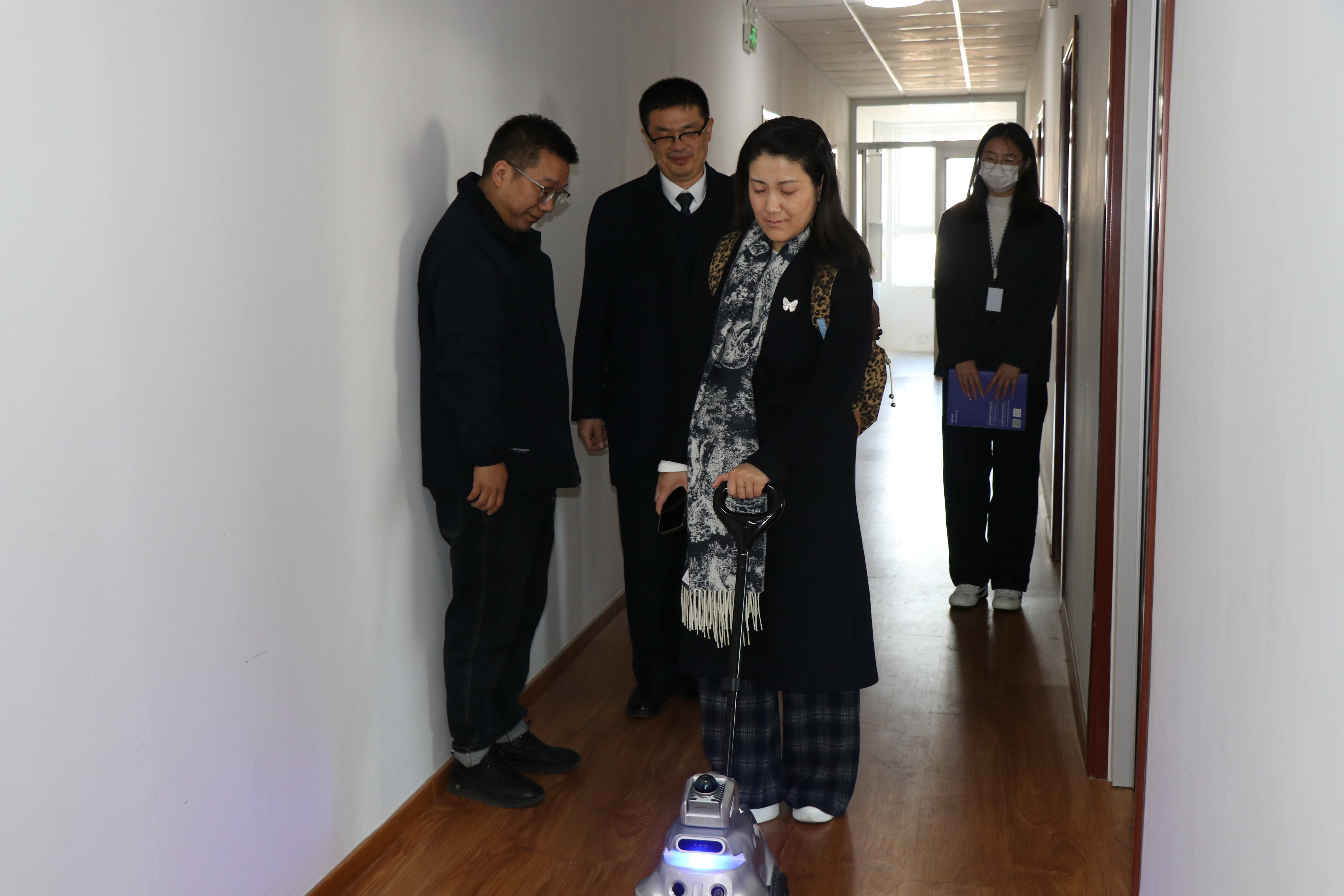 座谈会后,考察组来到AI LOOK盲人助理机器人研发室进行参观、体验。在主动引领模式下,机器人精准感知环境,稳稳引领柏华主席避开围观人群与各类障碍物,行进过程流畅安全;切换至推行模式时,遇到前方障碍,机器人会立即自动驻车,并通过震动及时发出预警提示;与此同时,机器人对围观场景的语音播报清晰准确。亲身体验后,柏华主席对AI LOOK 的出色表现赞不绝口。在任婷科长体验引领行走时,柏华主席特意在前方伸出腿模拟障碍,机器人迅速识别并丝滑完成绕障动作,继续平稳前行。一系列亮眼表现,赢得了考察组全体成员的一致认可与高度赞誉。